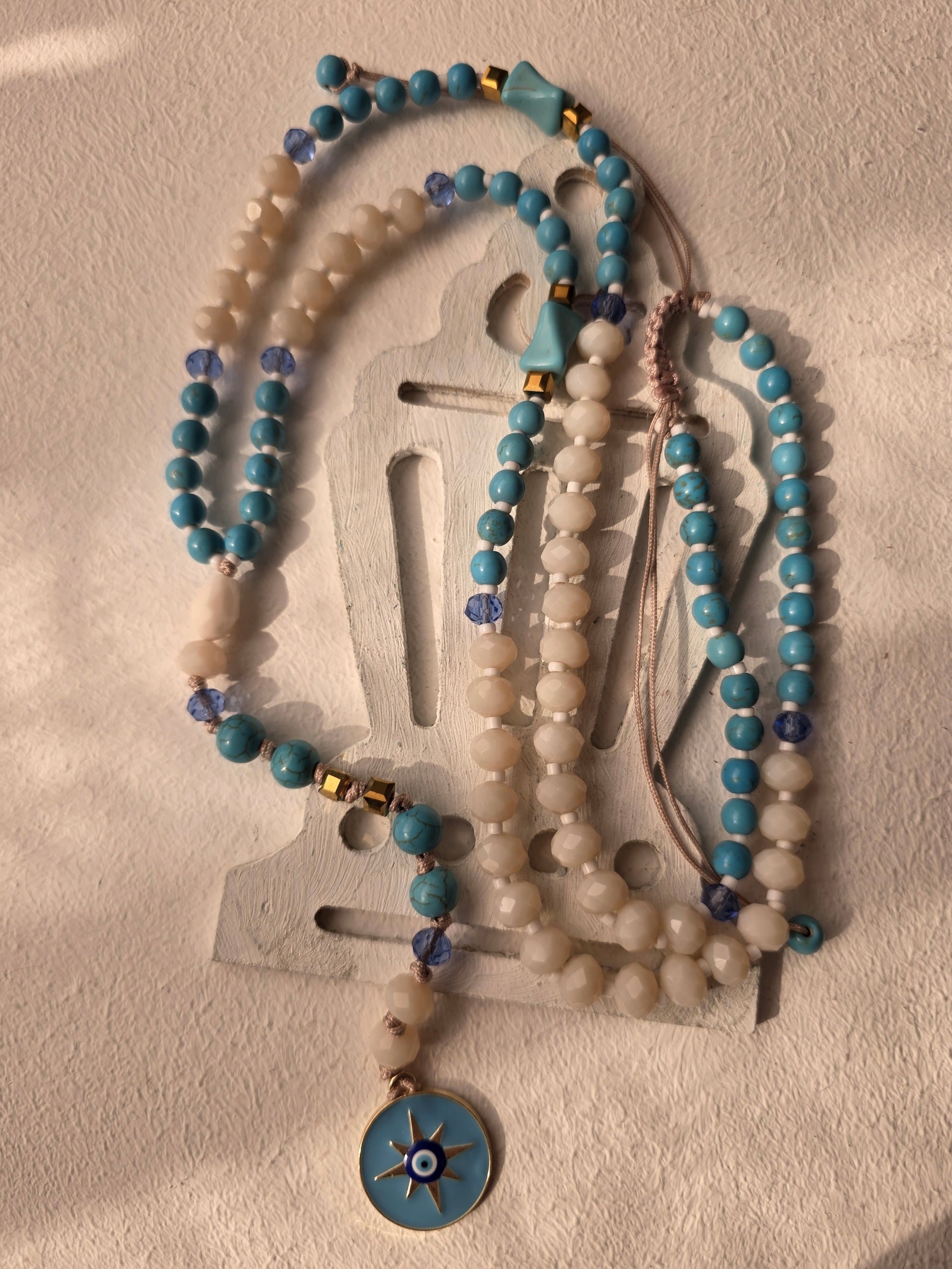 Embrace the spiritual beauty of Ramadan with this stunning handmade prayer beads set featuring natural turquoise and white stones with evil eye pendant. Perfect for daily prayers, meditation, and spiritual protection during the holy month and beyond.